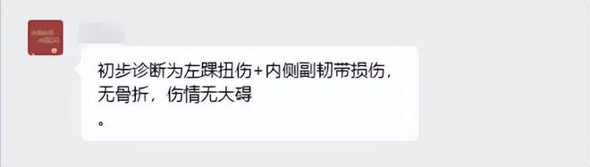 据了解,徐杰受伤后第一时间被送到医院检查。据篮球记者贾磊报道,徐杰的检查结果出来了,骨头和韧带都没事,只是硬伤,应该问题不是很大,球迷们可以放心了!也可以这样说,徐杰就是左脚踝严重扭伤。另据球迷群透露,徐杰左踝扭伤+内侧副韧带损伤,无骨折,伤情无大碍。不过徐杰肯定一时打不了比赛,从现场受伤情况来看,他起码要休息半个月以上。