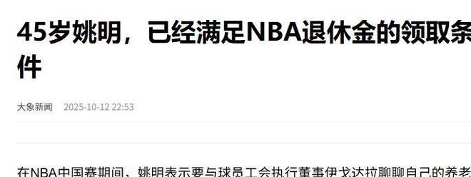 大象新闻:(45岁姚明,已经满足NBA退休金的领取条件2025.10.12)