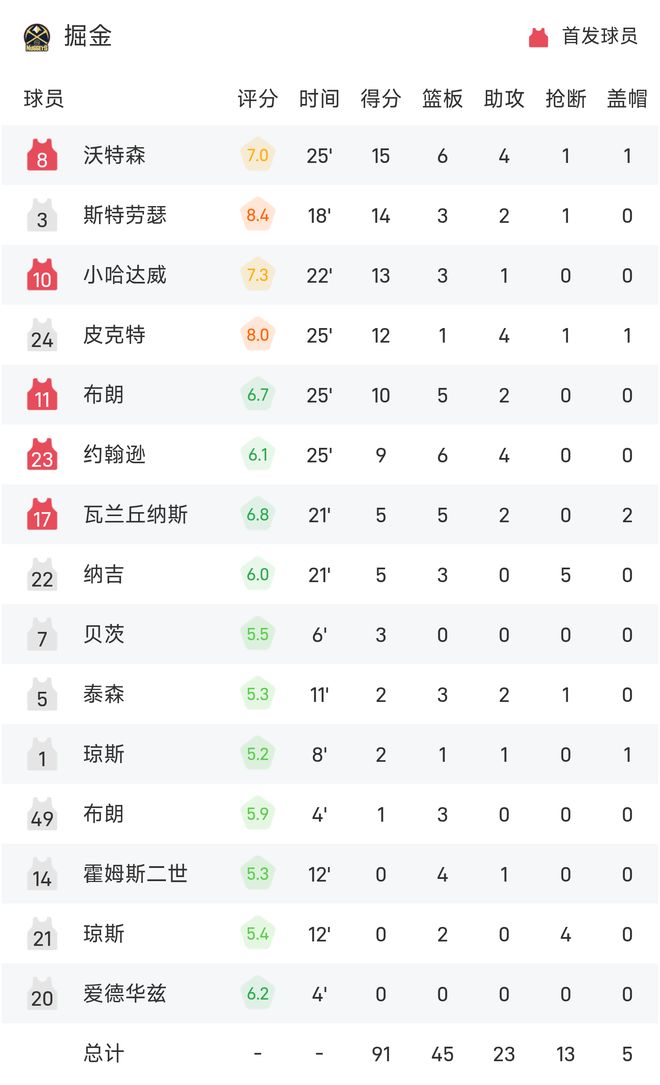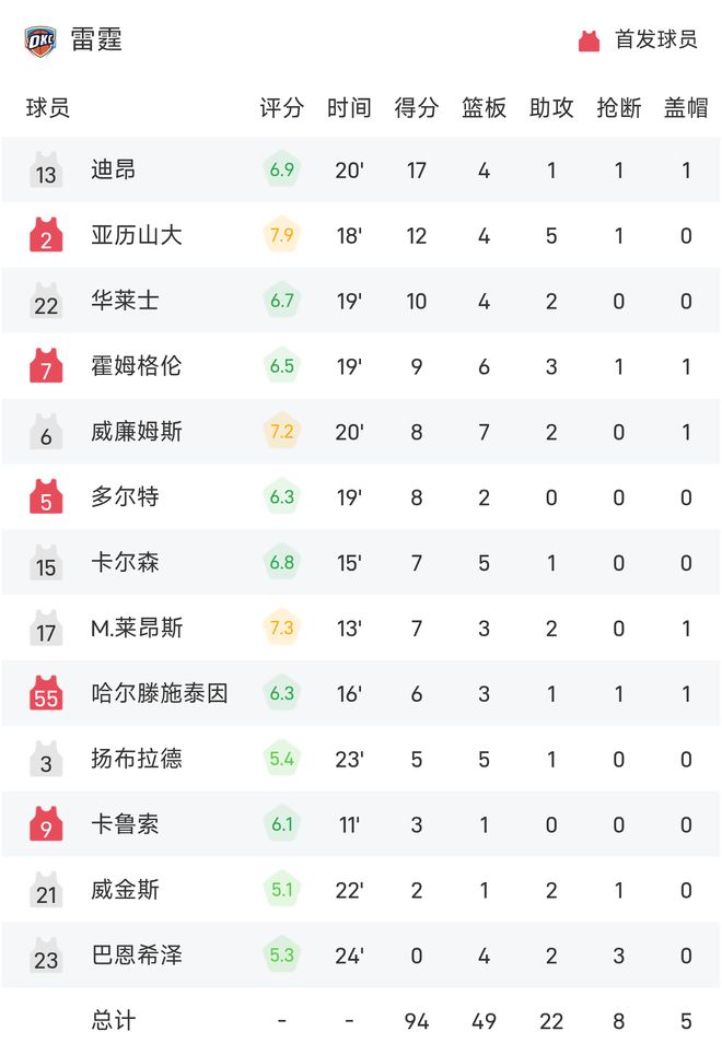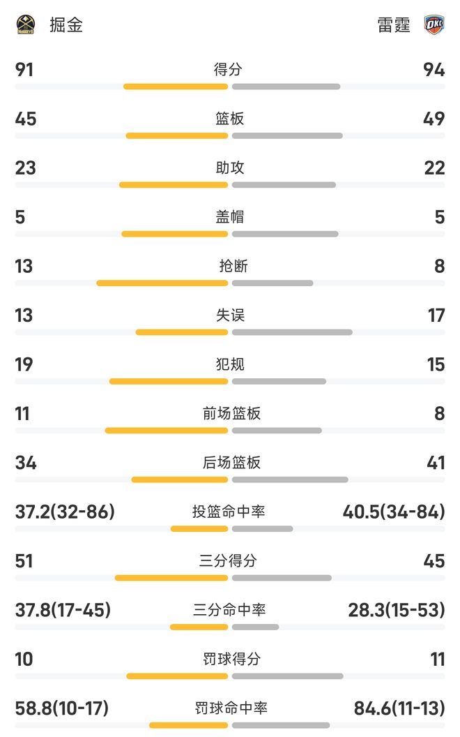 雷速体育10月18日讯 25/26赛季NBA 季前赛,雷霆对阵掘金。双方全场战罢,雷霆94-91战胜掘金。迪昂砍下全场最高的17分4板1助,率领雷霆成功取胜。球员数据 查看更多 详细数据 查