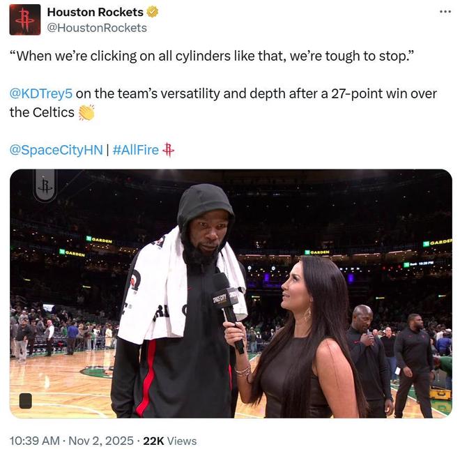 这对于火箭队长久健康使用37岁的杜兰特显然是个好消息,从后者赛后发声也不难听出他对于现状同样十分满意。