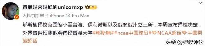 北京时间11月11日,据知名体育招募网站On3记者Joe Tipton报道,中国球员、18岁的四星中锋郇斯楠已经将大学择校范围缩小到三所学校——普渡大学、伊利诺伊大学和俄亥俄州立大学。