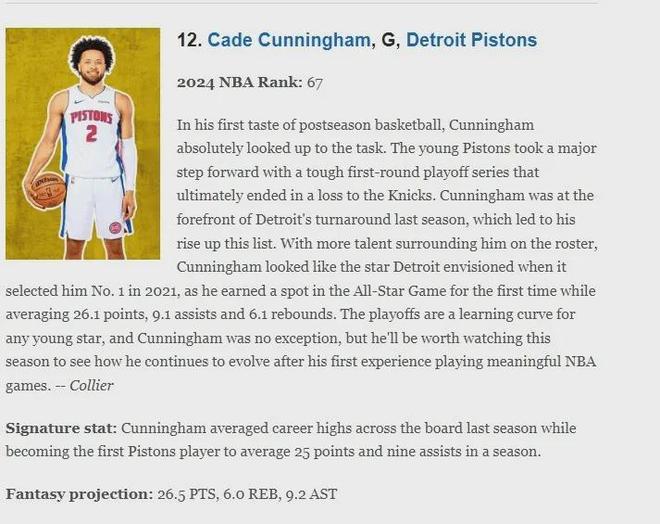 在赛季开赛前美国ESPN评选的NBA百大球星中,坎宁安位列第12位,而在2024-25赛季开赛时他的排位是67位,经过一个赛季打拼,他取得飞速进步,网站评语如下:坎宁安首次体验季后赛,就展现出了不俗实力,年轻的活塞队在季后赛首轮与尼克斯队展开了激烈较量,最终惜败,但他们仍然取得了长足进步.坎宁安是底特律复兴的关键人物,这也让他在这份榜单上名列前茅。随着球队阵容中更多优秀球员加入,坎宁安展现出了底特律在2021年选秀大会上用状元签选中他时所期待的明星风采.他首次入选全明星赛,场均贡献26.1分、9.1次助攻、6.1个篮板。季后赛对于任何一位年轻球星来说都是一次宝贵的学习机会,坎宁安也不例外.本赛季,他的表现值得关注,我们将拭目以待,看看他在首次征战NBA季后赛后将如何成长.