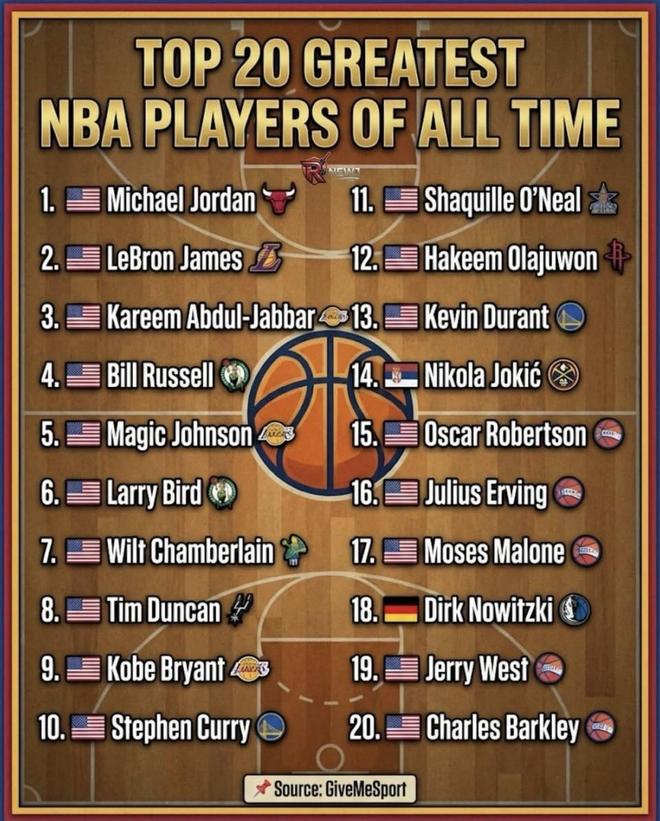 最近GiveMeSport发布了“NBA历史最伟大球员TOP20”,乔丹、詹姆斯、贾巴尔排在最前面,邓肯、库里、科比也都挤进了前十。榜单里最扎眼的其实不是这些名字,而是他们被摆在了哪个