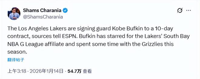 - 北京时间1月14日,据名记Shams报道,湖人已同意与后卫科比-巴夫金签下一份10天短合同。巴夫金是2023年NBA选秀的...发表于: 01-14 11:35