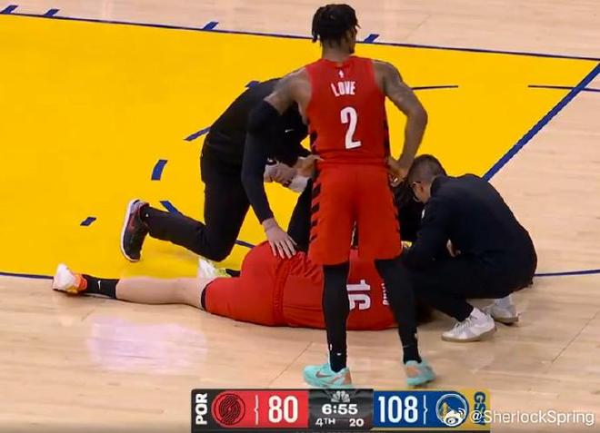 在比赛进行到第四节时,杨瀚森获得出场机会。在一次进攻回合,杨瀚森倒地拼抢,但后脑勺不慎撞到勇士后卫威尔-理查德膝盖上,倒地后杨瀚森非常痛苦,迟迟未能起身。开拓者医务人员及时进入场内进行检查,在场的开拓者队友也都围绕在杨瀚森身旁关切地关注着他的情况。