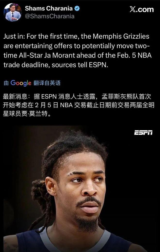 莫兰特有太多的问题了,已经被灰熊摆上货架,今年交易截止日(2月6日)前大概率离队。