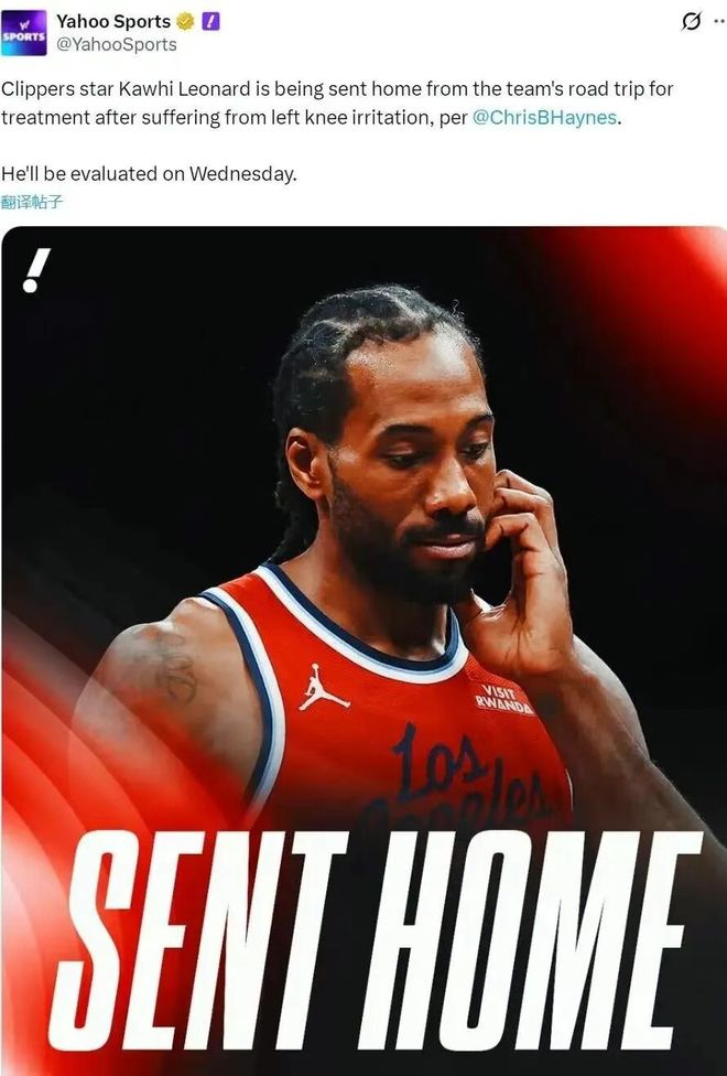 当洛杉矶快船队带着五连胜的余威开启东部客场之旅时,恐怕没人能料到,他们的“北伐领袖”会以这种方式提前退出战场。球队官方宣布,科怀·伦纳德因左膝挫伤引发的炎症反应,已提前