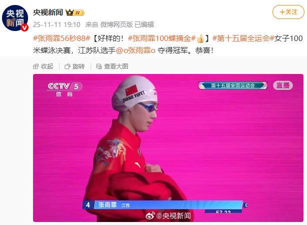 据央视新闻微博消息,第十五届全运会女子100米蝶泳决赛,江苏队选手张雨霏夺得冠军。编辑 李忆林子