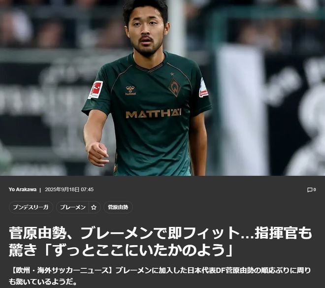 菅原由势加盟数周即征服不莱梅上下,主帅:他仿佛一直在这里