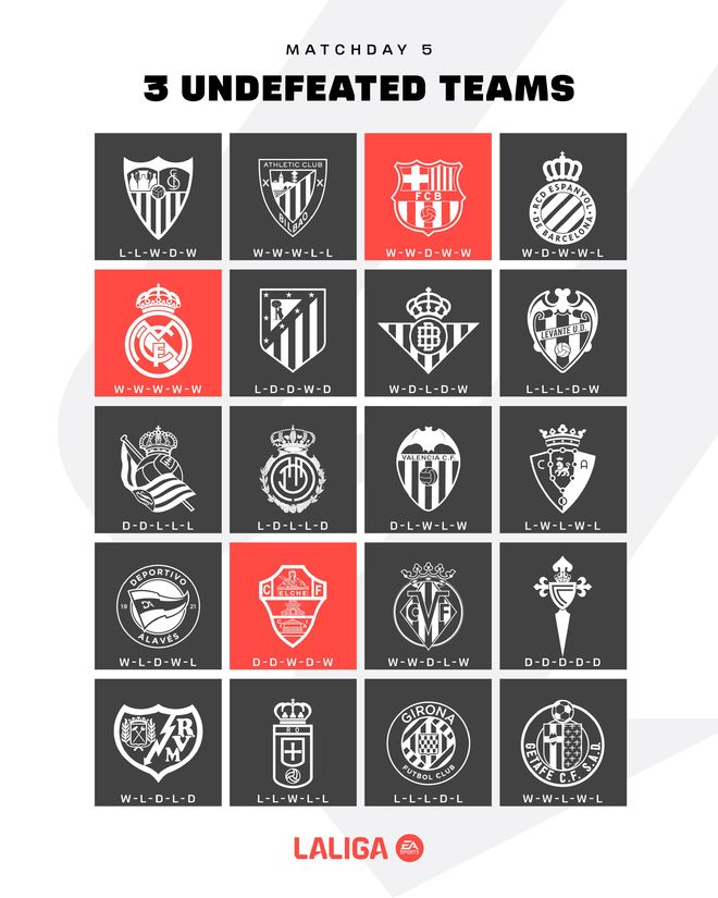 雷速体育9月23日宣 今晚西甲第6轮打响,皇马将客场挑战莱万特。据统计,截至目前西甲联赛仅有3队未尝败绩,其中包括皇马、巴萨和埃尔切。详细战绩如下: