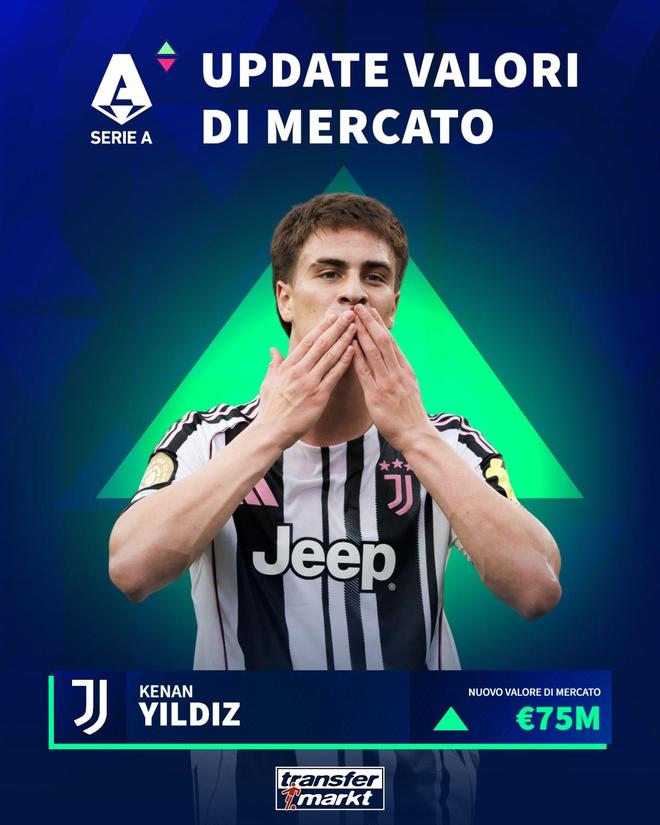 考虑到这些因素,伊尔迪兹的身价上涨50%,从5000万欧元升至7500万欧元,这不仅合情合理,也实至名归,使他跻身意甲身价最高球员的前三名之列。