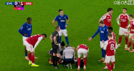 第45+1分钟,卡拉菲奥里争顶摔到后脑勺,队医赶紧上场治疗
