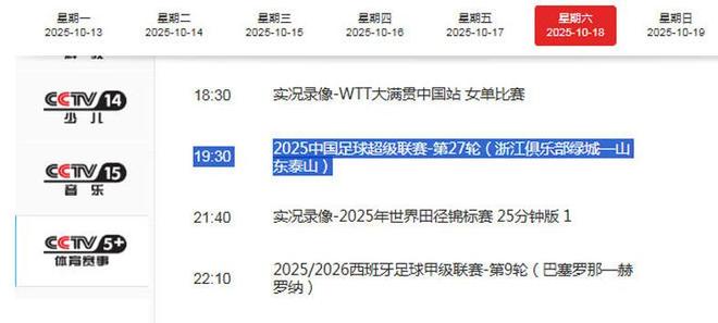 央视直播浙江VS泰山!韩鹏倒数第二场米神PK瓦科王钰栋PK李小恒
